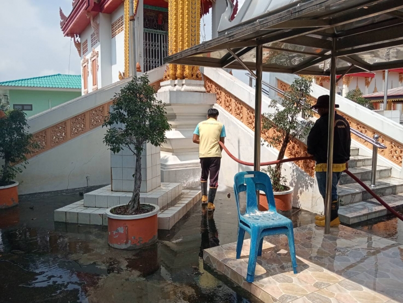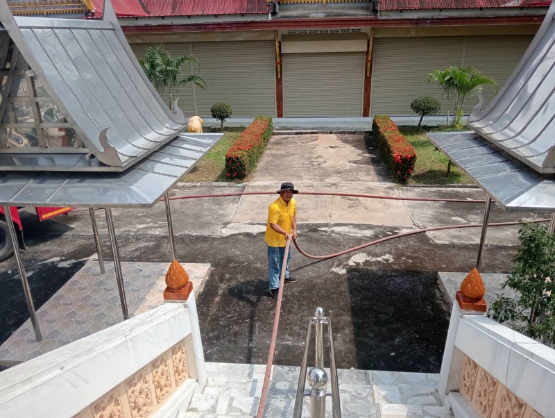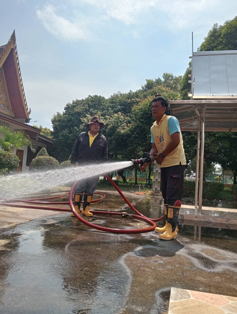 วันจันทร์ที่ 15กันยายน 2568 เจ้าหน้าที่งานป้องกันฯ นำรถบรรทุกน้ำ ออกบ้างเมรุ และพื้นลานปูนรอบเมรุ ณ.วัดบุญเกิด หมู่ที่ 3 ต.โพธิ์รังนก.